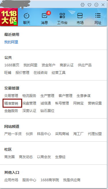 点击我的阿里——应用-——点击编辑应用,然后就可以看到精准营销这一选项。当然我们还有第二个入口,是在千牛上面的入口。