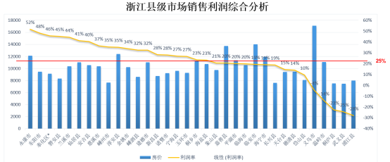 从销售利润率看,超过40%以上的有永康市、东阳市、奉化区、磐安县、兰溪市、仙居县;超过30%以上的有安吉县、慈溪市、嵊州市、淳安县、余姚市、嵊泗市、建德市。销售利润率=(房价-地价-土地外成本)/房价,土地外成本按3500元估算。