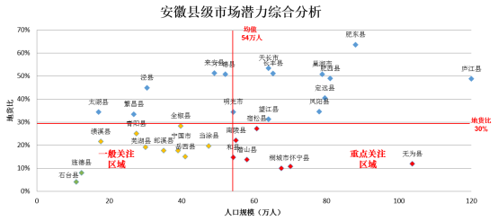 从市场潜力看,安徽省县级城市应重点关注桐城市、怀宁县、无为县、潜山县、和县、南陵县、宿松县;一般关注岳西县、宁国市、郎溪县、芜湖县、当涂县、绩溪县、青阳县、全椒县。