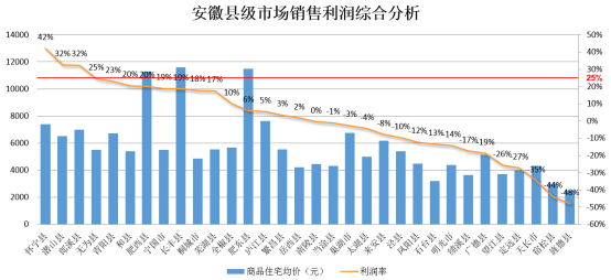 从销售利润率看,40%以上的有怀宁县;30%以上的有潜山县、郎溪县。销售利润率=(房价-地价-土地外成本)/房价,土地外成本按3500元估算。