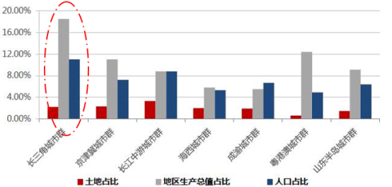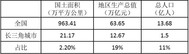 长三角城市群是我国目前最为成熟的城市群,城镇分布密度达到每万平方公里80多个,是全国平均水平的4倍左右,长三角国土面积占全国的2.2%,地区生产总值占全国的19%,人口占全国的11%。