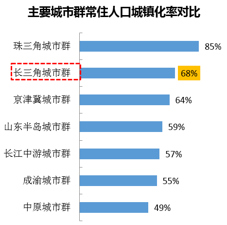 目前,长三角城市群常住人口城镇化率为68%,高于我国常住人口城镇化率57.4%。长三角城市群26个城市中城镇化率高于60%(高于全国平均水平)的城市有21个,城镇化水平相较其他城市群发展较高;长三角城市群商品房销售金额为2.6亿元。