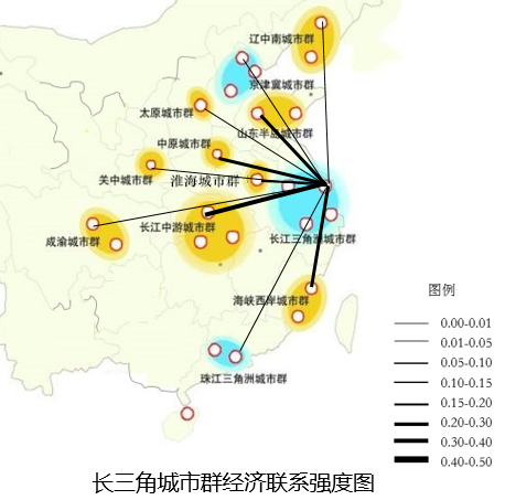 从城市群经济联系强度图可以看出,长三角城市群和长江中游城市群联系最为密切,其次与山东半岛、中原及海峡西岸城市群联系较为密切。
