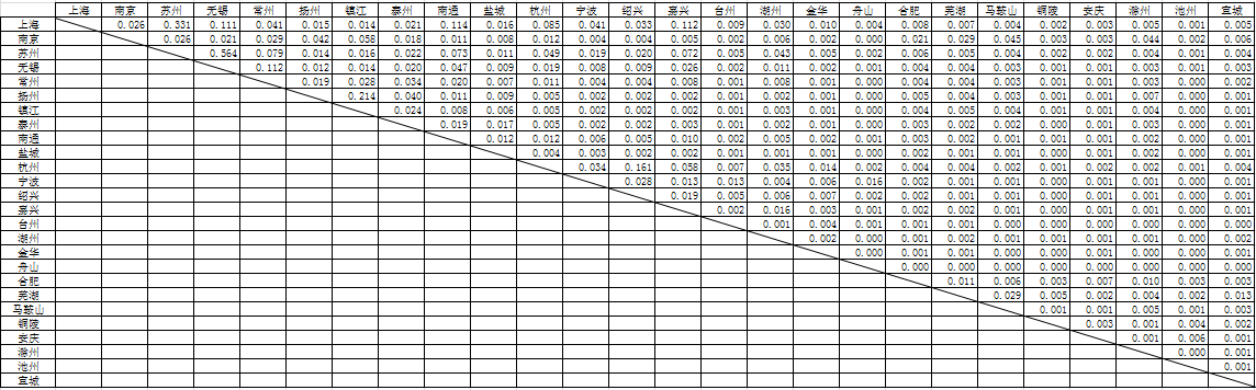从长三角内部城市经济联系强度表可以看出,苏州和无锡(0.564)上海和苏州(0.331)、扬州和镇江(0.214)联系最为密切,其次杭州与绍兴(0.161)、上海与南通(0.114)、上海与嘉兴(0.112)、无锡与常州(0.112)、上海与无锡(0.111)等城市联系较为密切。