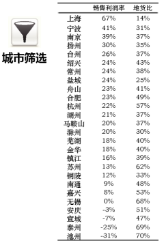 从销售利润率看,40%以上的有启东市、仪征市、太仓市、海门市、句容市、宜兴市;30%以上的有江阴市、丹阳市等地均具有较大潜力。销售利润率=(房价-地价-土地外成本)/房价,土地外成本按3500元估算。