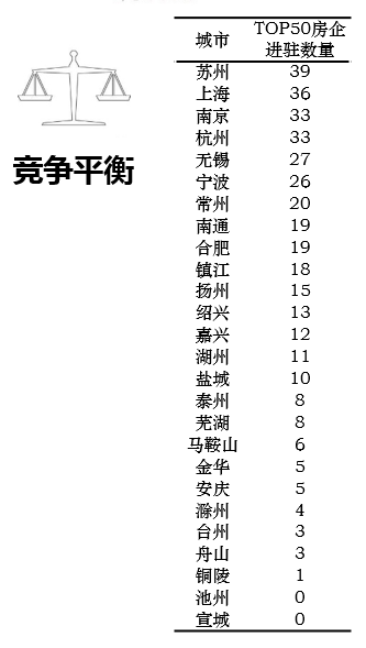 充分考虑TOP50房企之间的竞争平衡,苏州、上海、南京、杭州已进驻TOP50房企超过30个,应重点关注市场竞争带来的非理性拿地风险。