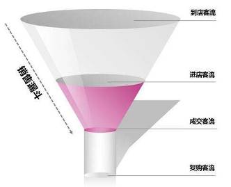 如果你是开店的老板,经过你店门口的客流、进店的客流、最终成交的客流、复购的客流,他们之间是有一个比例关系的。通常到店面的顾客,如每天有10000个人从店门口经过,可能进店面的人有1000人,买东西就200百人。那么这个关系就有点像漏斗一样,一层层漏下来了。