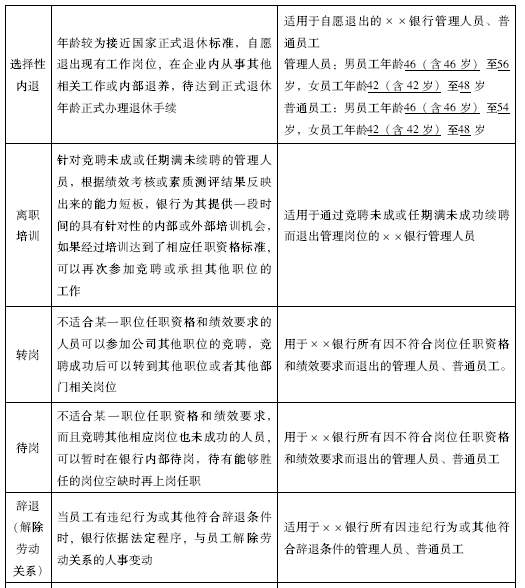 在系统梳理已有的退出管理办法的基础上,结合自身对退出机制的理解和经验,针对××银行管理人员、普通员工的退出机制进行了系统思考,坚持绩效杠杆与年龄杠杆两个原则,设计适用不同类别人员的退出机制。