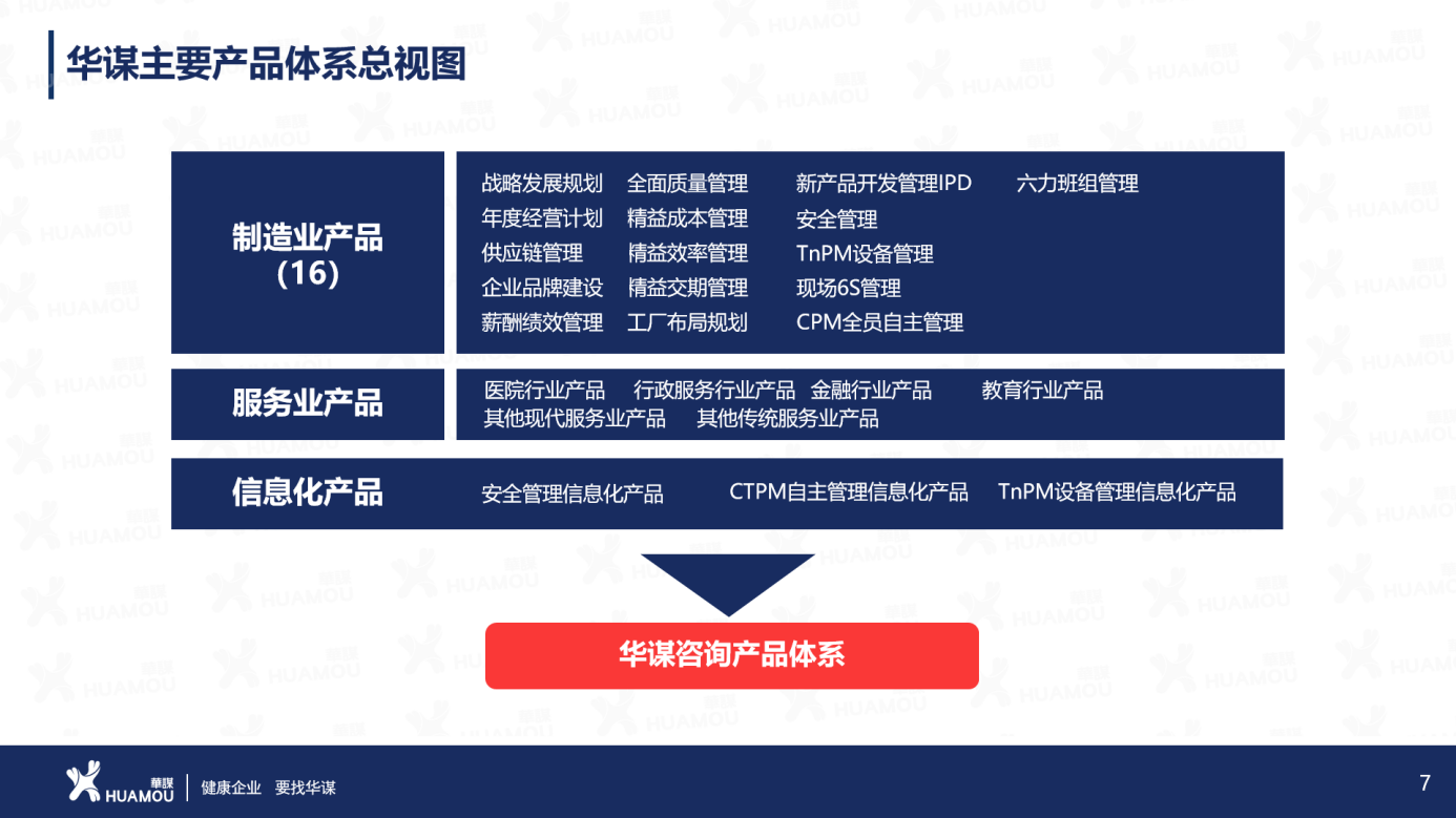 华谋咨询为客户提供管理咨询+信息一体化的专业服务,拥有原创的管理理论体系及经过数千家企业实践提炼的管理技术,形成十大咨询方向:基础管理增值系列、生产增值系列、供应增值系列、营销增值系列、人资增值系列、财务增值系列、研发增值系列、运营增值系列、战略增值系列、其他增值系列。华谋咨询股份服务领域涵盖全部十大行业:采矿与冶金行业、化工与原料行业、食品与包装行业、家居与休闲行业、电子与电器行业、机械与设备行业、交通与运输设备行业、能源与建筑行业、传统服务业、现代服务业;以研究非自然生命体发展周期的十个阶段为对象,为非自然生命体可持续健康发展、提供全方位一体化第三方技术服务。
