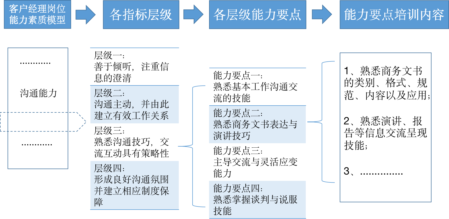 一般来说,能力素质指标可以分为三级行为等级:基本合格、胜任、优秀或是未达标、达标、超越期望,行为程度可根据公司实际情况来定。培训前需要确定每个胜任力指标的学习目标。同时结合能力素质模型的整体架构,能力可以分为知识(K)、技能(S)、职业素养(C)三个类别,这可以为后续的学习方式的选择提供依据。