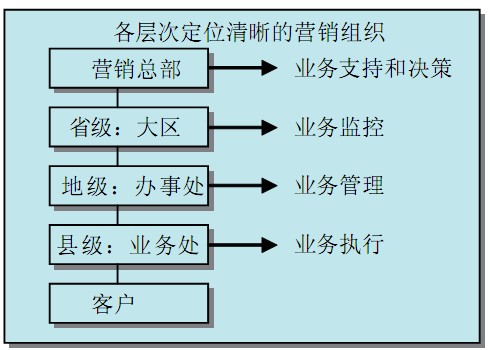 第三,层次职能清晰:总部负责全国性策略、计划、年度目标等重大事项的决策,全面支持区域队伍的营销工作,负责内部管理和建设,对一线队伍提供业务指导,而将日常性、区域性业务决策权力下放。