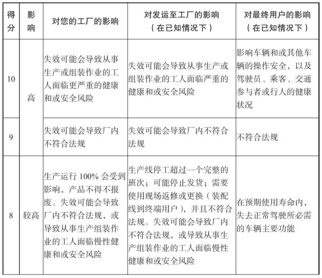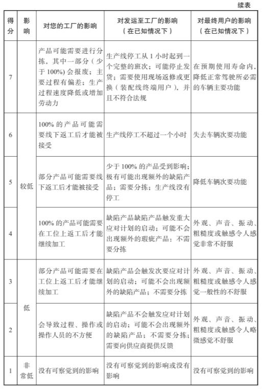 严重度评分S是指失效模式导致失效后果的程度,可以从对下工序影响、对直接客户影响、对间接客户影响几个方面来考虑。比如料没有烘干,失效后果是产品变形、尺寸超差,导致后果是50%以上产品报废,对直接客户影响是没办法组装,因为流不到间接客户处,只要从对下工序影响和直接客户影响两个方面来评分。评分标准如表2-6所示。