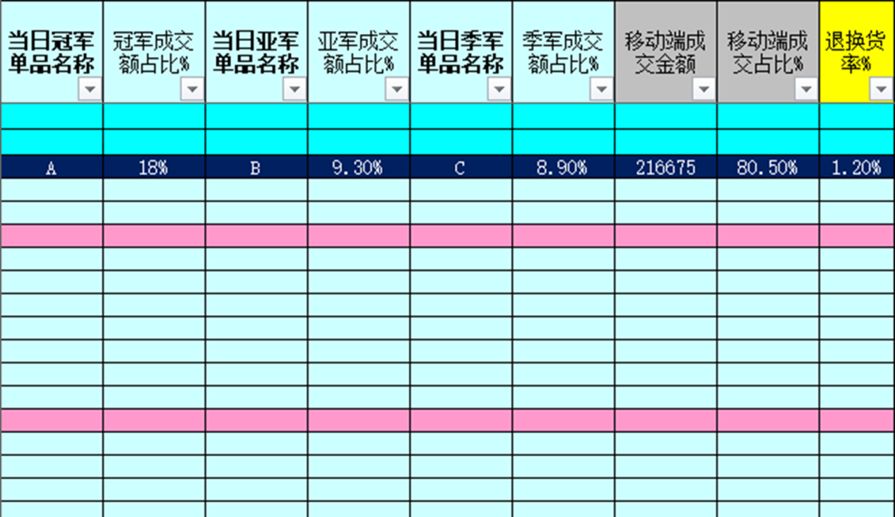 这个模块最大的价值就是要时刻留意排名靠前的单品是否就是你正在主推的单品,如果不是,说明你的单品挑选出了问题,或者说产品结构选品出了问题。
