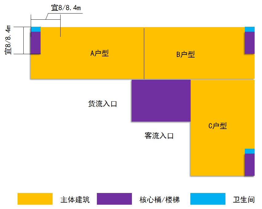 “L”字型厂房适用于一核三户型厂房。宜用8米、8.4米柱网,根据面积、层数的要求,可布置成9000~15000平方米单栋厂房,单层不宜低于1500平方米,不宜高于2500平方米。