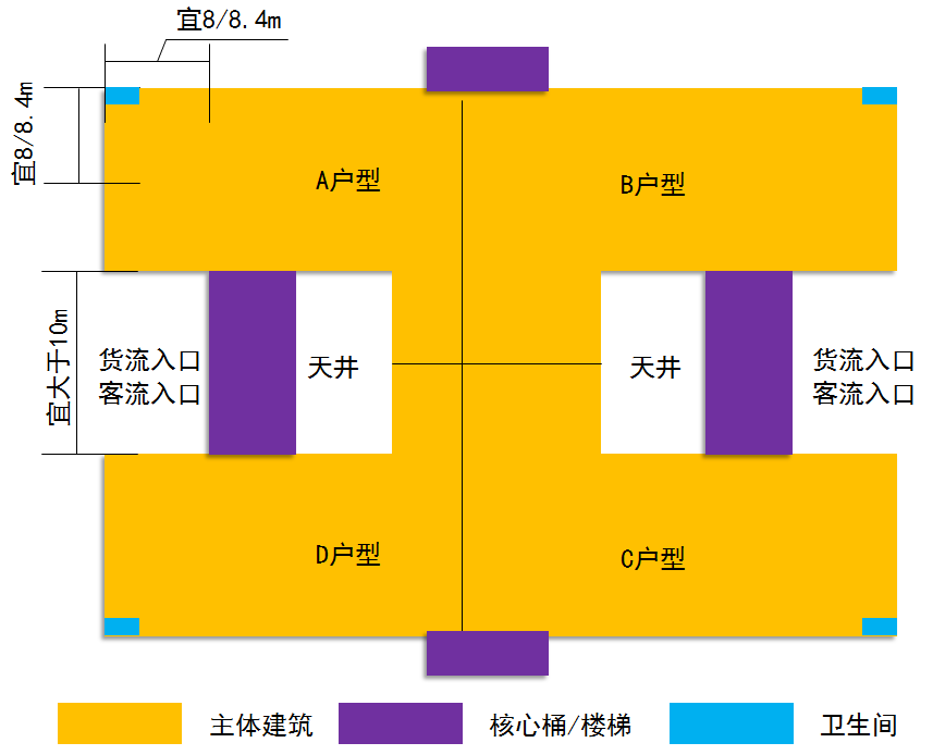 “日”字型厂房适用于一核四户型厂房。宜用8米、8.4米柱网,根据面积、层数的要求,可布置成18000~24000平方米单栋厂房,单层不宜低于3000平方米,不宜高于4000平方米。