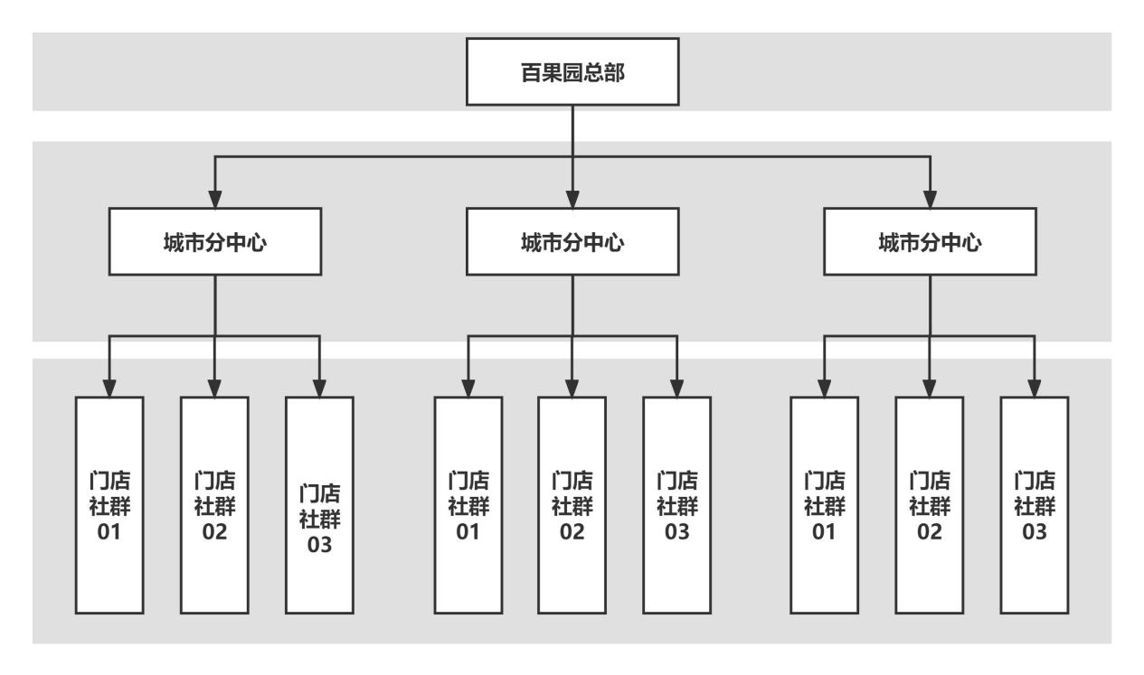 对于大部分零售连锁企业来说,转型社群营销时,社群的组织架构模式同样可以参考三层级的划分。以百果园为例,其社群组织架构如图12-2所示。