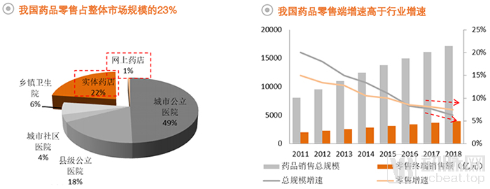 图1-1 我国药品零售端在医药市场的占比与增速 {图右下水印覆盖文字}