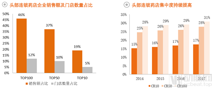 此外,连锁药店中CR10/CR50/CR100从2014年到2017年逐年上升,说明行业集中度在持续提高。