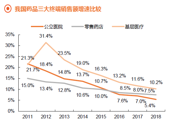 2018年我国药品销售三大终端销售额合计1.71万亿元,同比增长6.3%。目前我国药品销售规模仅次于美国。公立医院终端销售额合计1.15万亿元,占比67.4%,是最大销售终端。三大终端增速均呈下降趋势,公立医院终端下降最快,如图1-4所示,这主要是受到医保控费措施影响。