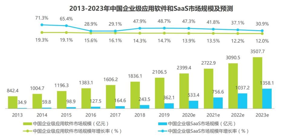 金融SaaS | 236亿 | 49.6% | 市场主要分为零售银行、支付清算、信贷融资、资产和财富管理、保险科技、监管科技6个赛道。主要的市场参与者包括2大类:1)互联网厂商如阿里巴巴、腾讯、百度、京东数科等。2)上市公司如中科软、宇信科技、南天信息等。 | |