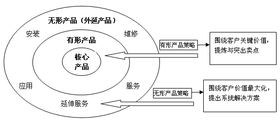 在图3-5中,中心圆圈代表了工业品的核心产品,是提供给客户的产品基本效用,即产品本身的使用价值。第二层是有形产品,代表看得见、摸得着的硬件产品,如设备的规格、样式、功能、性能与外观。第三层是无形产品,代表了软性服务体系,包括维修、安装、组装、调试等。
