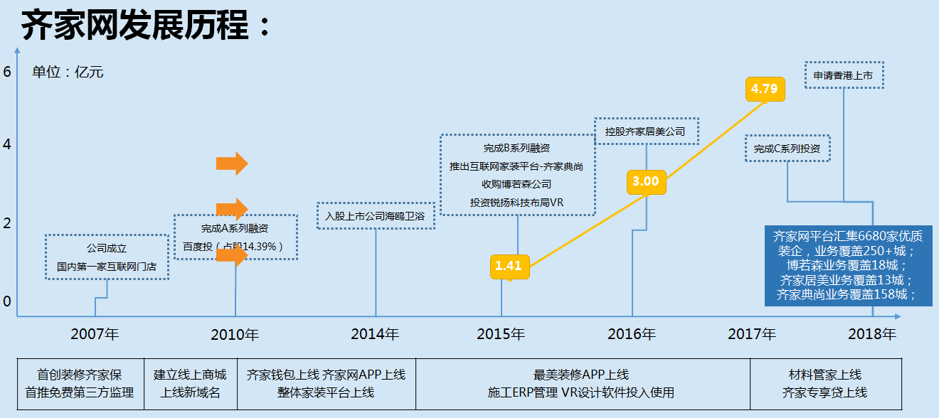 2018年齐家网在港递交IPO申请,预成为互联网家装平台上市第一家企业。齐家网以团购起家,而后逐渐转型为互联网家装平台。弗若斯特沙利文报告显示,2017年中国家装服务行业市场达到2.3万亿元,在线家装服务行业按照GMV 计算,2017年市场规模达到1267亿元,齐家网拥有25.7%的市场份额。