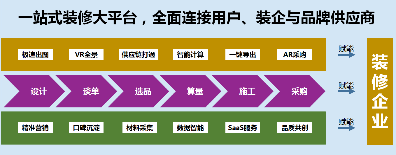 第三阶段:技术服务赋能。家居家装企业极度分散,技术相对落后。平台企业通过为家居家装企业输出技术服务来改善其供应链和管理能力,降低运营成本,提升服务效率。