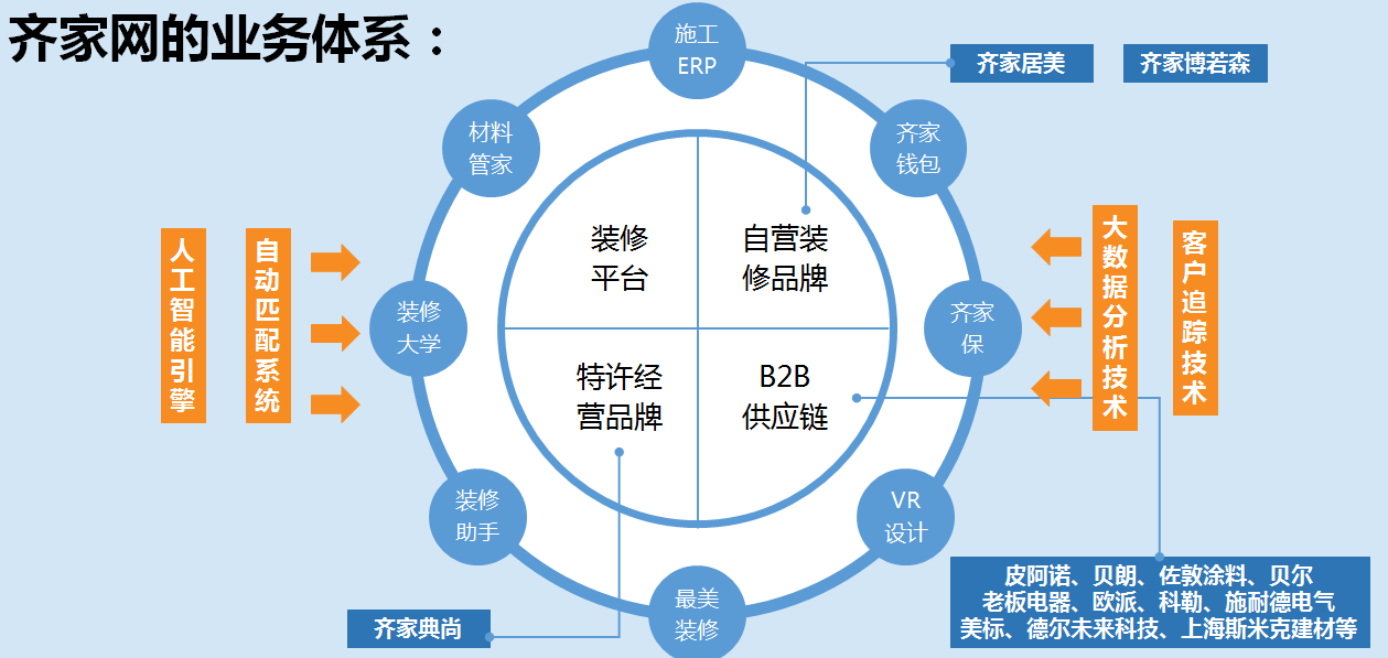 2.齐家装修:齐家装修业务上主要提供三类产品:(1)一口价施工包;(2)一站式整装包;(3)装修公司与消费者之间的中介