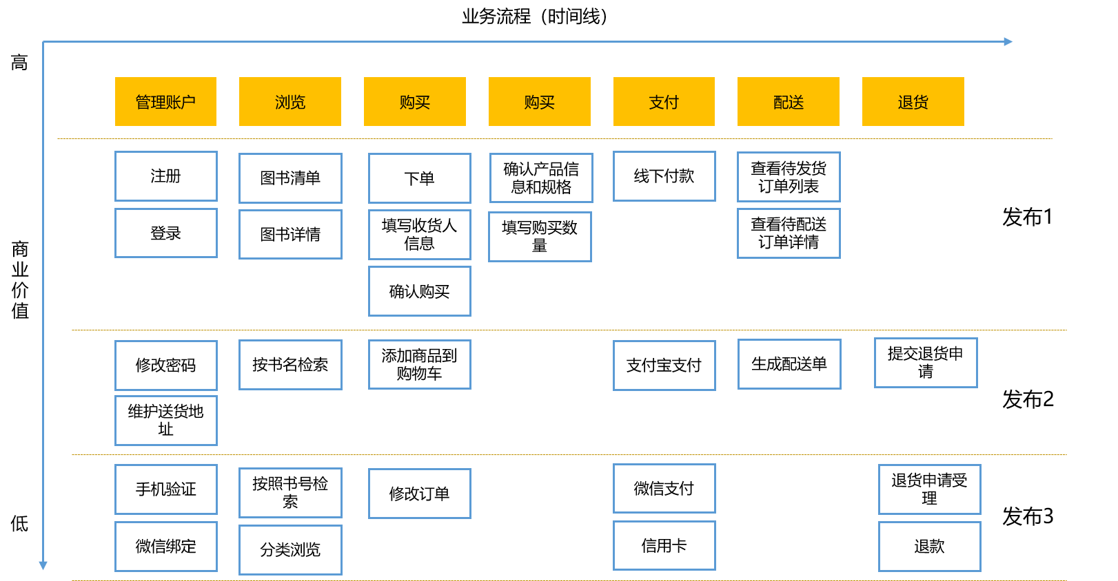故事图是一种既定产品所应具备的所有特性和功能的可视化模型,旨在使项目团队对其所创建的产品及创建原因有整体了解。图8-31是一个在线购书网站的故事图示例。
