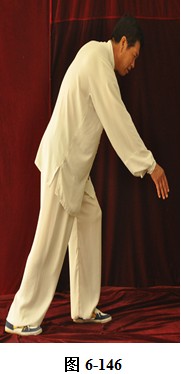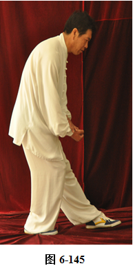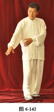 接上式,腰微拱,右手慢慢向右下採,同时右脚落平。左腰随即左外上提,左手顺势左挒,身体转向朝东。右脚随左手掌左挒内转,脚尖朝东。右手内旋翻手心朝上,左腰向右微合,左脚跟随向里转,左手顺势搭于右手腕部。腰下沉,两手随向下打挤。同时左膝放松,左腰微提随之后拱,左脚向左前迈出,脚掌虚着地面。右腰上提走弧线,右掌随之向前划平圆,腰回拱上提,右手随之回收胸前翻转掌心向内。不停顿,左掌随右手前送顺势自然回放左膝外侧,身体随腰走弧线向前移动,重心至左腿,成左弓步,眼神向下远视。腰回拱,重心随之移于右腿,右掌回抽至小腹前。腰微含上提,掌心慢慢翻转向上高过头顶,腰随之向后倚靠,右手随之翻转向右外侧上方,手心朝前。左手心朝向地面, 重心落于右腿上,成后倚之式(见图6-142至6-148)。