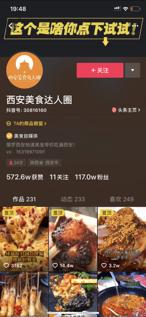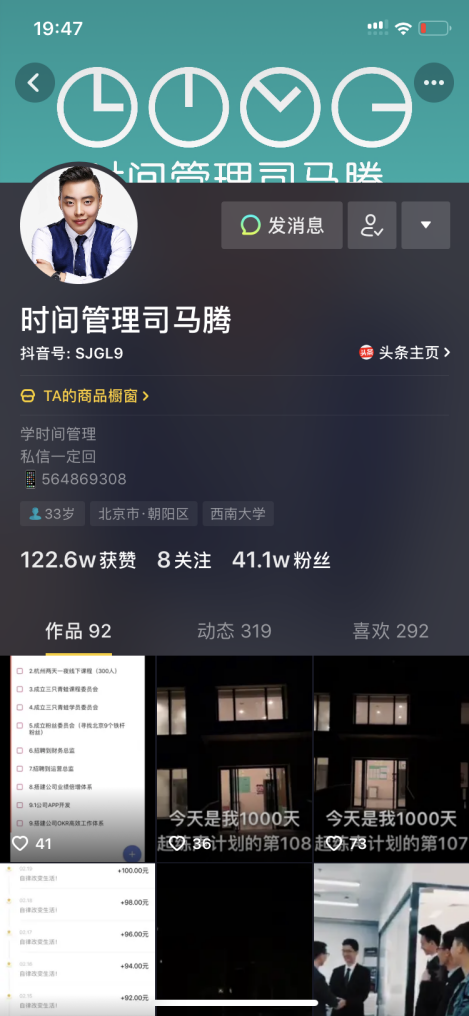 背景墙是指,点进账号主页,最上面的一张图片。比如下面两个案例:“时间管理司马腾”的头像上面是四个时间图和七个汉字(时间管理司马腾),如图4-6所示。“西安美食达人圈”的背景墙,则是一个文字图片“这个是啥你点下试试”(图4-7)。
