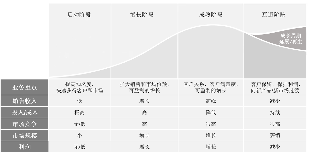 企业业务生命周期(Business Lifecycle),是企业的业务(产品或服务)在一段时间内分阶段发展的过程。大多数企业都会经历业务生命周期的四个不同阶段:启动阶段、增长阶段、成熟阶段和衰退阶段。企业在不同阶段面临不一样的业务挑战,需要以不同的战略进入市场。如图2-2所示。