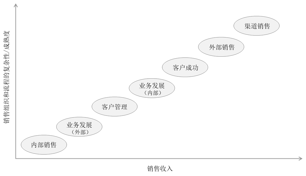 启动阶段,很多企业,特别是初创企业,由于资金有限,难以吸引和培养优秀的销售人员。这一阶段,企业通常使用通用型销售人员完成所有销售相关工作,销售队伍的规模往往较小。销售人员的主要目标是尽可能多地获取客户和实现销售。销售人员必须全力以赴发现和接触潜在客户,对潜在客户进行“教育”,让客户了解产品和服务。无论销售额是多是少,销售人员需要抓住每一次销售机会,影响客户的购买决策,尽可能多地完成销售业绩。有的情况下,企业也会要求销售人员实现其他目标。例如,电子游戏行业和在线教育行业,除了销售业绩,尽可能多地收取预付款常常是一个业绩目标。