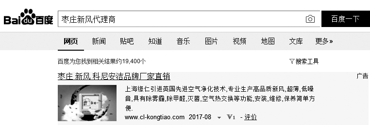 点击【插入地域通配符】后,在标题填写框的最前端就会出现{投放地域},不同于关键词通配符,地区通配符是固定的,不能修改和替换。当不同地区的人在百度搜索看到此广告时,该通配符就自动替换成当地的地区名。如图3-38所示,这是2017年8月16日广告展现的结果,客户搜索的是枣庄新风代理商,广告中自动加上枣庄两个字,关键词不再是我们写在通配符里的关键词——“家用空气新风系统”,而是“新风”。前者是地域通配符的结果,后者是关键词通配符的结果。