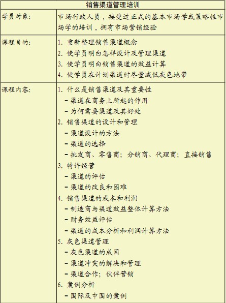 在所有的培训项目中,有关渠道管理的培训内容参考如下: