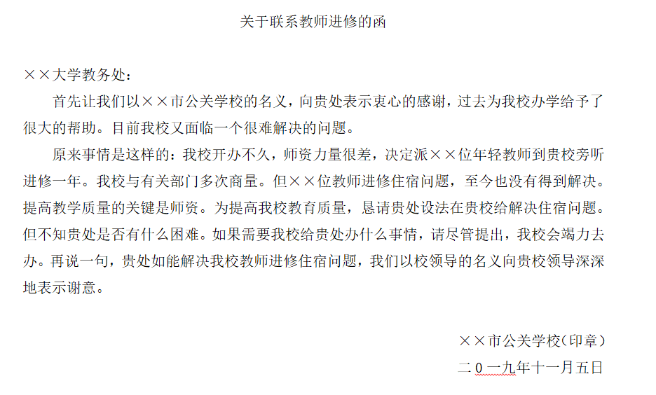 标题与内容不对应。应改为“关于请求解决我校进修教师住宿问题的函”。