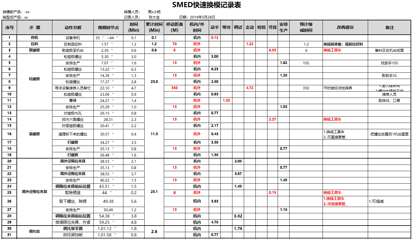 从表3-13中可以看出,其实在操作的过程中,员工还不一定在2个小时内能完成换模作业,根据录像分析得出实际总换模时间为2.3小时。从表中可以看出很多的问题点,比如: