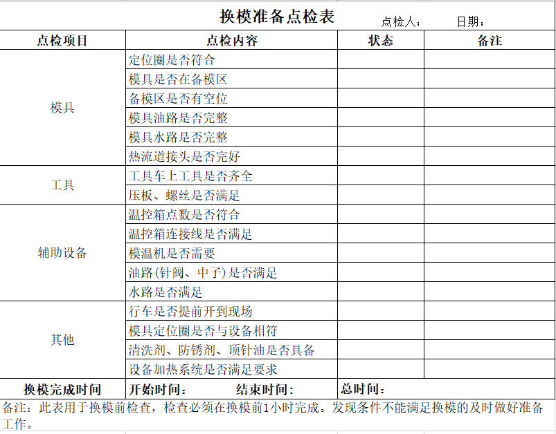 动作七 | 在换模前由专人对工具进行点检检查 |