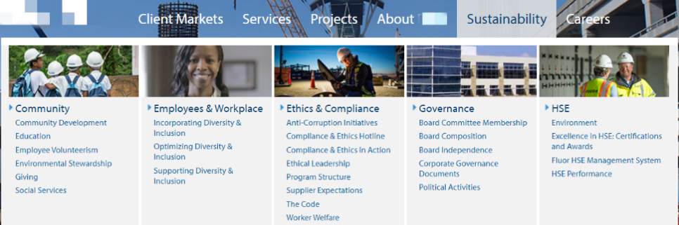 d) 对于规模更大、要求更高的项目,如EPC工程承包,那么需要展示的内容就更加多面,层次也更高。比如健康、安全与环境(HSE/Health, Safety and Environment),企业社会责任(CSR/Corporate Social Responsibility),道德与合规(EthicsandCompliance),在一些大型工程商的网站上,常常都是作为主要导航栏目来展示的。他们会从国际认证证书、管理层履历、内部反腐败措施、员工职业发展规划、曾参与的社会公益活动等各方面,向潜在客户展示自己是多么可靠、可信。