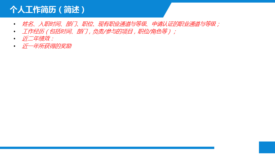 参加述职答辩的申请人需在参加述职答辩前2个工作日完成《述职答辩报告PPT》,整理相关证据,并报直接上级进行证据真实性审查通过之后(具体要求参见附件《认证证据整理指南》),提交给认证组织人员。