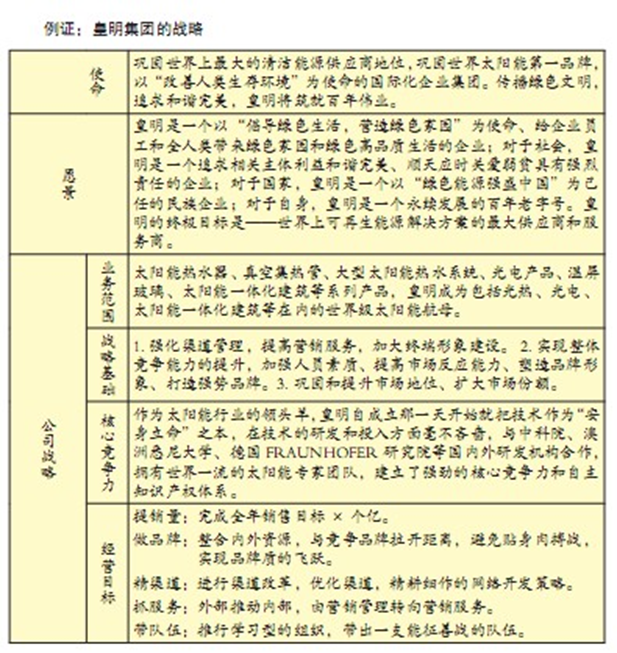 皇明的成功,取决于其长期的、有规划性的公司战略、营销战略、职能战略的确立(如表2-4所示),皇明太阳能中央热水系统已推广几千万平方米,累计节约标准煤1000多万吨,减少相应燃煤污染排放量50多万吨,创造出巨大的经济效益和社会效益。现在全国有太阳能热水器生产厂家近4000家,皇明太阳能集团规模最大、技术能力最强,年产热水器50万台,真空管1200万支,成为中国太阳能行业的第一品牌。2006—2012年皇明全面实施了“太阳谷”计划,再一次实现了从产品到产业的升级。在山东德州,一个占地3000多亩震撼世界太阳能产业谷全面崛起。