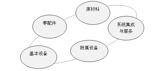 唐纳德(Donald D. Lee,1984)从供应商、加工商、用户这一价值链的角度,将工业品划分为工业初级产品和工业加工产品两大类,忽略了系统集成等工业工程服务产品。结合中国的实际情况,工业品通常可分为五大种类:原材料、零配件、基本设备、附属设备、系统集成与服务。如图1-1所示。