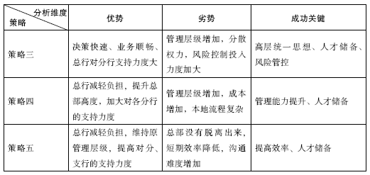 策略五是为避免层级过多、增加管理难度而采取的暂时措施,是策略四的过渡,最终要走向策略四的管理模式,所以策略四是中小银行最终设立前、中、后分离,总行、分行、支行合理建设精品银行的最终走向。