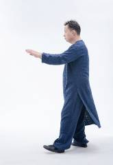 1.双手慢慢放到胸前成按式,同时右实脚随着双手的下降跟着再度松沉,左脚尖维持点地。
