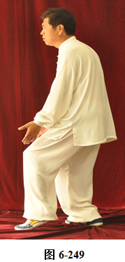 接上式,腰微含,左腿屈膝下垂,左脚向后落步;腰微含,向左转,身体随之左后转,重心落于左腿。右脚尖随身体左转向里转, 腰微拱,重心随之落于右腿,左脚跟随右脚内转向里转。腰下沉, 两腿屈膝,两臂随腰下沉由掌变松拳,拳心朝上。跟着向下划立圆于腹前;腰上提,重心落于右腿。提左膝,腰微含向前蹬出,脚掌心朝外。两臂随腰上提,由松拳变掌向上搂至胸前,随腰微含向前蹬脚时,两臂向左右开,掌心翻转朝外,眼神注视前方(见图6-247至6-250)。