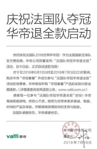 华帝“退全款”广告及兑现声明