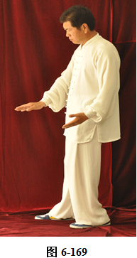 接上式,腰微含,向右外转,重心随腰转落于右腿,两手由捋式变右搬捶,右掌变松拳,左手仍搭在右拳腕部,与右膝成三角。左腰微上提,左脚提起,向前上一步;松腰微拱,向右外平转,上提向左旋转,身体随之缓慢左转。随转体右拳自右肋旁而上向胸前方搬出,随搬随着臂外旋,使拳心慢慢翻转朝上,随即渐渐向左下弧形抽回,左掌也同时随转体弧形向右经右臂里侧前拦,掌心朝右, 眼神观注左掌。腰后拱,重心移于右腿,右拳弧形收回胸前,左掌护住右拳,左掌在前,右拳在左肘里侧(见图6-165至6-173)。腰微含,右膝微屈,身体后倚,右臂拳随身体后倚,略收胸前。腰右外旋转,随转左脚往右里侧内扣,脚尖朝向西北。左臂回拉,向里翻转掌心朝下,重心移落左腿。腰微含,右拳随重心转移左腿变掌, 成左抱球状。