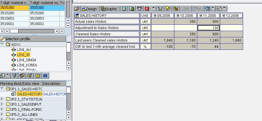 需求计划流程包括4个步骤:销售记录调整、统计预测、销售计划调整和最终计划。我们可以从图3-1的左下的Planning/book栏看到其包含从IP1.1到IP5.1四个条目。计划员在每个PLANNING BOOK中执行一个步骤,当前的是IP1.1销售计划调整。