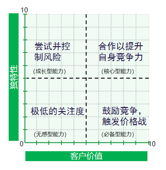 再来看对于“核心型”能力的态度,由于这部分能力对于客户的价值很高,而且在这方面,竞争对手不具备或者较弱,客户往往会非常愿意快速展开合作。