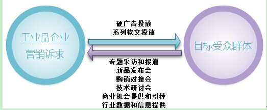 如果能创新使用行业媒体资源,则不仅能使工业品企业的媒体呈现方式更加丰富多样化,且能有效提升投入产出比,也从某种程度上解决了媒体广告效果无法定量评估的难题。如图4-6所示的模型,通过工业品企业与媒体的良好互动合作,不仅多层次解决了工业品企业想要对目标受众群体传递的营销诉求,而且能够通过媒体平台将销售过程嫁接。